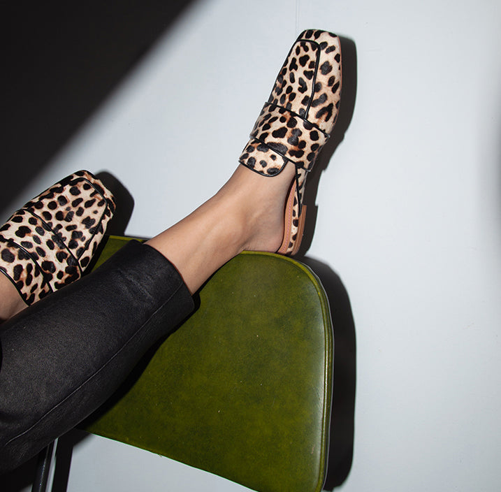 For textured genuine hide like the Leopard Major Mule, clean by dusting excess debris with lint mitt or brush, use a damp (not wet) cloth to spot clean any marks, and allow to fully dry before storing away again.